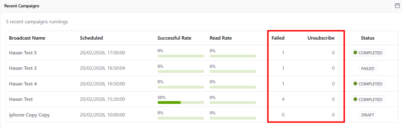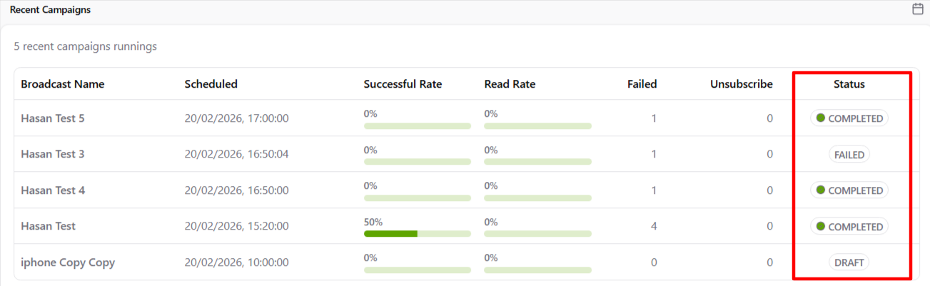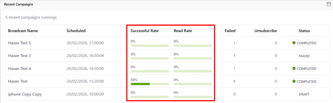 Percentage of messages successfully delivered (e.g., 50% or 0%). Green bar shows progress visually. - Read Rate