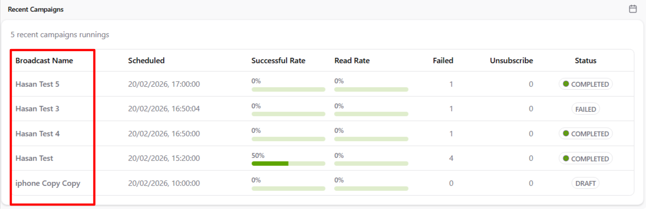 The name you gave to the campaign (e.g., "Hasan Test 5", "iphone Copy Copy").