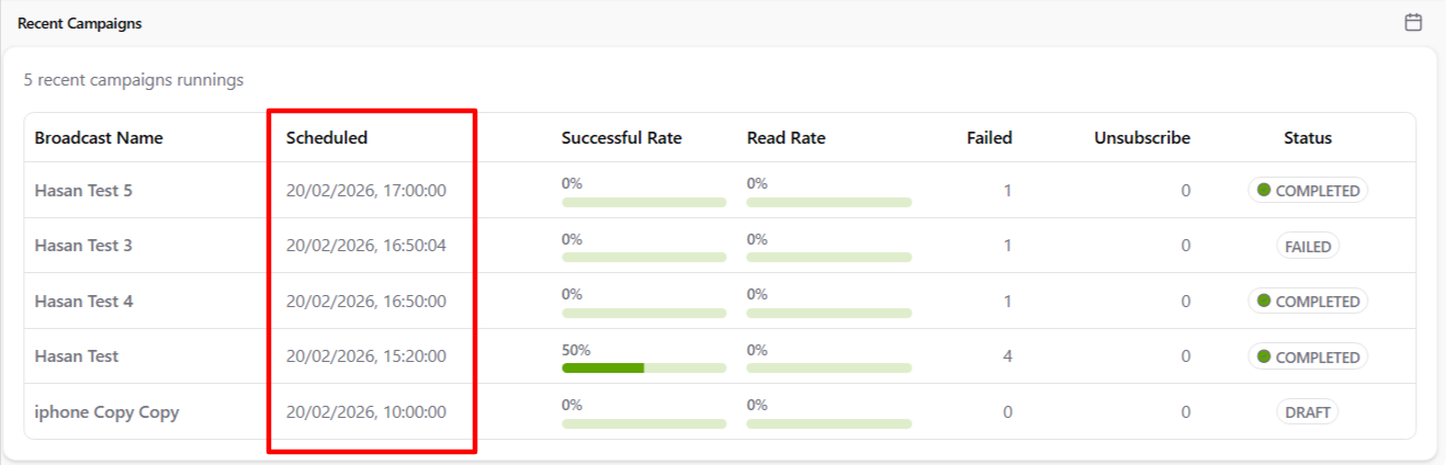 The date and time the campaign was set to start sending (e.g., 20/02/2026, 17:00:00).