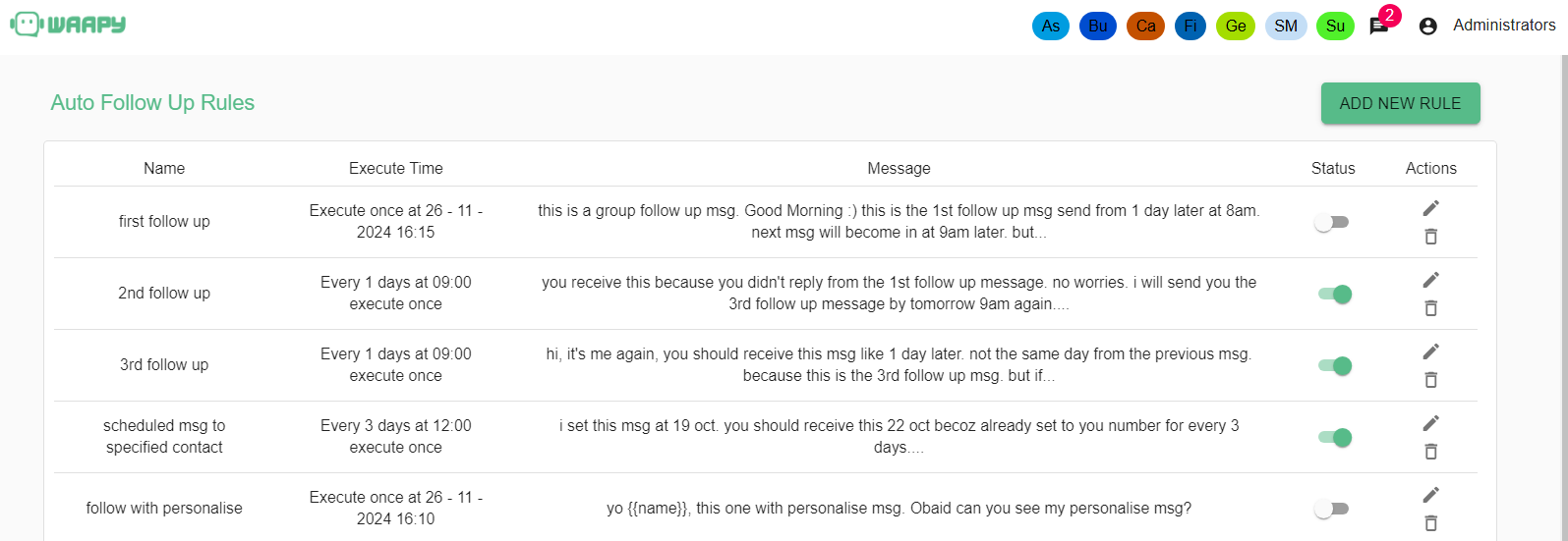 - Here the auto follow up user interface. It can help to auto send message to a specific user or tickets by setting it. You can add a new follow up rules by clicking on the “ADD NEW RULE” button. Besides that, you can edit or delete the rules too.