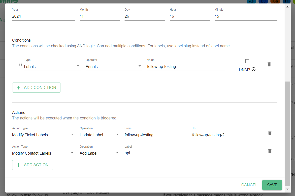 - For the actions, it will be executed when the condition is triggered. So, like the message is sent out to the labels of follow-up-testing, but the clients still are not replying to any message, then the system will change the label of the tickets to follow-up-testing-2.