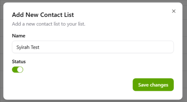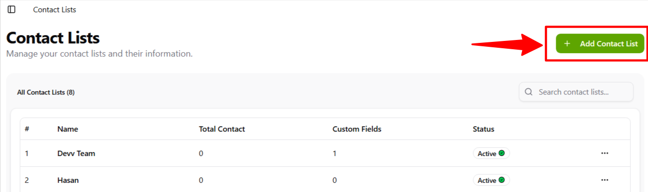 You can add new contacts directly to an existing contact list by clicking Create New button.