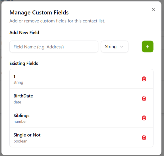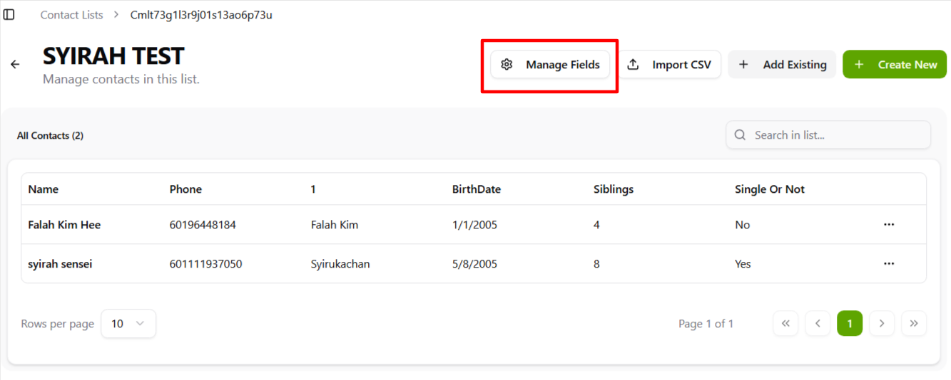 Use the Manage Fields button to add custom fields to your contact list. By default, only Name and Phone Number are included. For example, you can add Department, Role, Birthdate, etc.