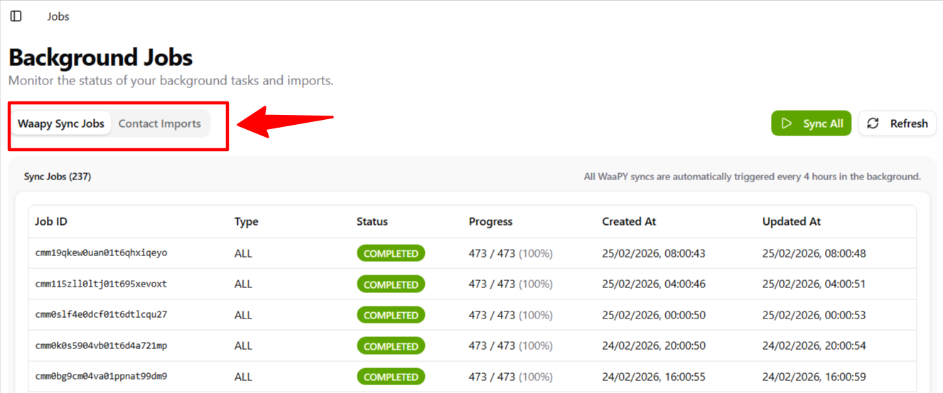 4. You can filter the processes to show either Waapy Outreach Sync Jobs or Contact Imports.