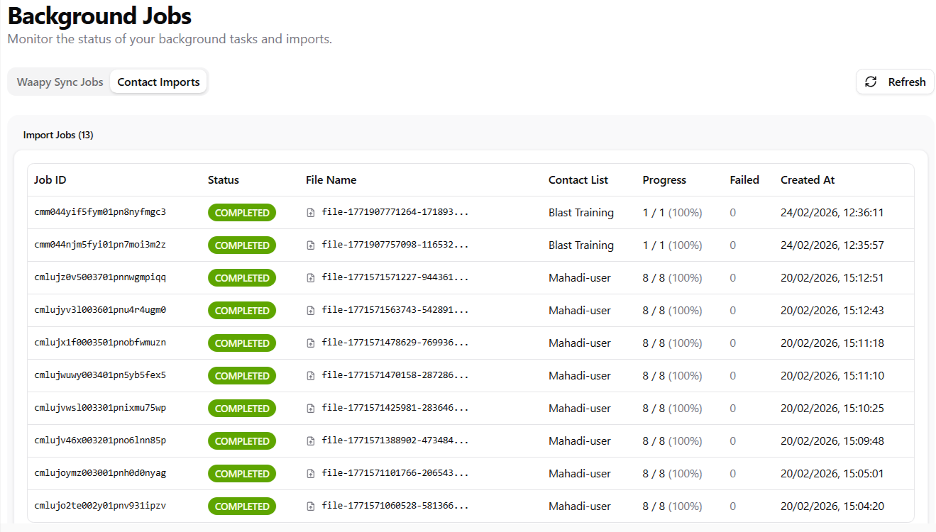 If background job late to capture the contact imports processes , can click button Refresh to load the latest processes.