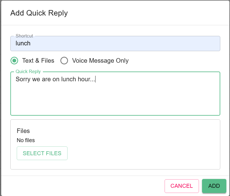 - Enter the keywords and the corresponding message and click “ADD”. You can attach the files on it too.