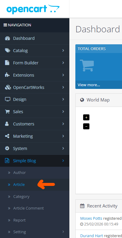- The Article page is located on the left-side panel under the Simple Blog menu.